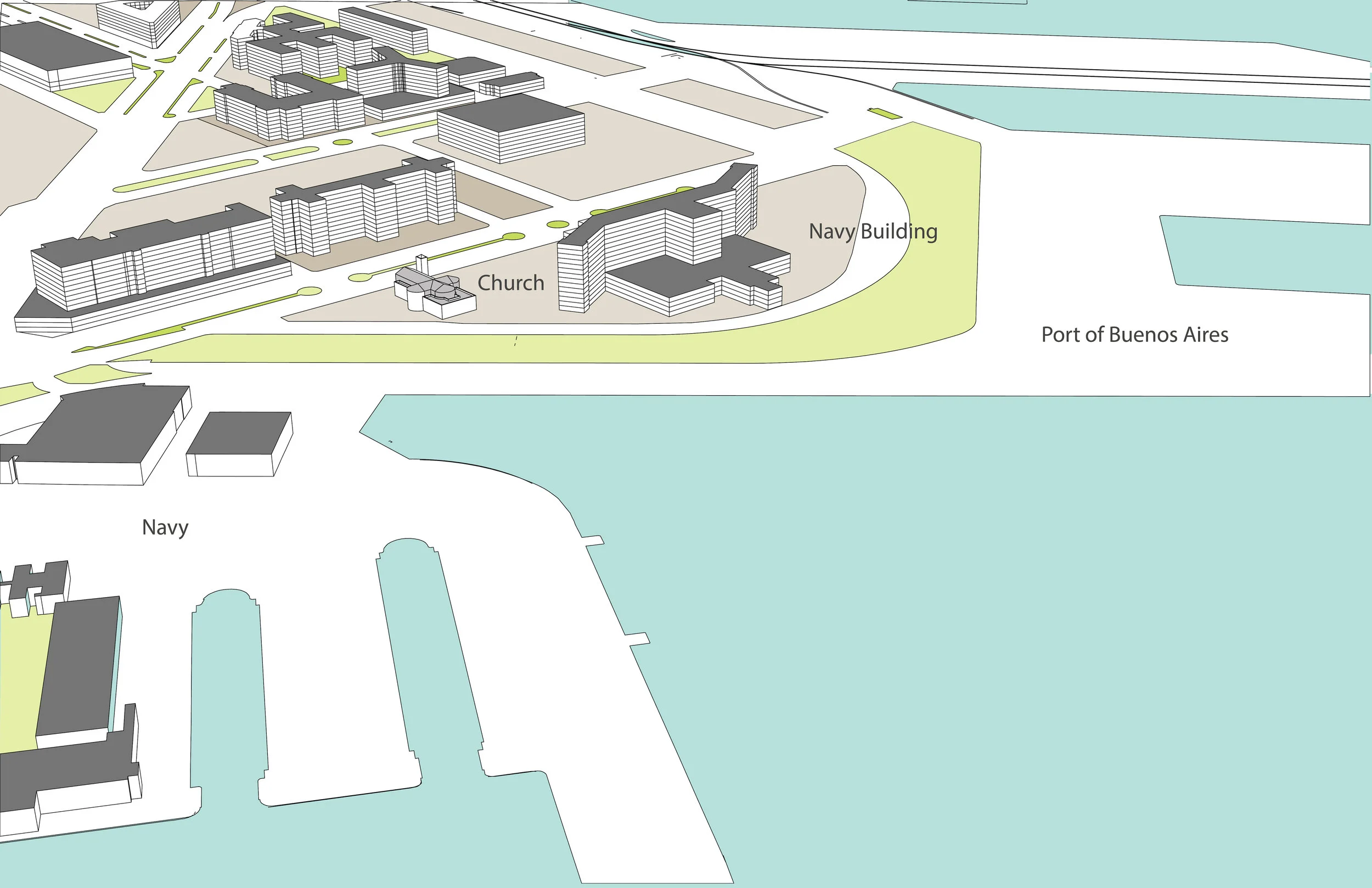 The waterfront plaza brings the City of Buenos Aires back to the water. This is accomplished by creating strategic open space insertions and new infill buildings in what is currently an amorphous and empty area. By creatively appropriating a small church that is currently inaccessible and situated behind gates to offices of the Argentinian Navy, the plaza makes use of existing buildings to create a new public space inspired bysome of the best public spaces in Buenos Aires. The naval church, currently isolated and closed to the public, becomes transformed into the centerpiece of a new waterfront plaza.